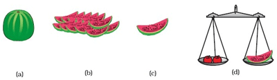 در شکل بالا در (a) یک هندوانه، 12 قطعه هندوانه در (b) ، در حالت (c) شما 12/1 هندوانه را می بینید و بالاخره در شکل (d) می بینید که چگونه با این مقیاس می توان میوه های دیگر را وزن کرد. شیمی دان ها هم از کربن برای وزن کردن اتم ها استفاده می کنند.